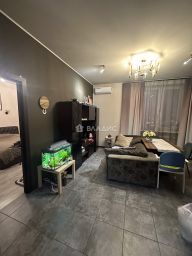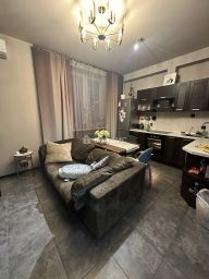 Кухня-гостиная: кухонный гарнитур , двухкамерный холодильник, микроволновая печь, большая индукционная плита, духовой шкаф с максимальным набором функций, кран с фильтром и носиком для питьевой воды, встроенный измельчитель, вытяжка, большой раздвижной диван, диванный столик-трансформер для рабочего места, большой раздвижной стол из массива березы и 4 стула, телевизор Hisense 55 дм, рулонные шторы блэкаут (Италия), тюль и шторы, кондиционер воздуха Митсубиси, комод из натурального дерева, 2 люстры, 4 бра, кухонная подсветка. Потолок подвесной, на потолке балки из натурального дерева (сосна).