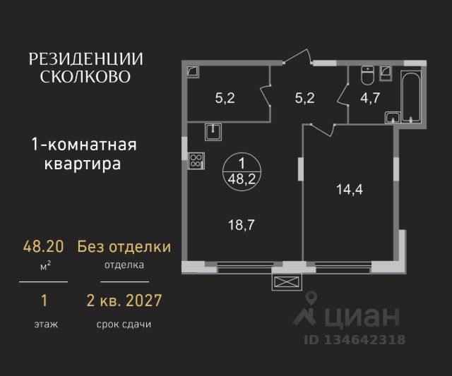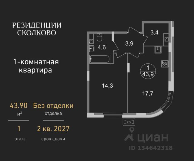 Продается однокомнатная квартира в девятиэтажном монолитном доме жилого комплекса "Резиденции Сколково". Общая площадь квартиры - 43,9 кв. м, этаж 1 из 9. Срок сдачи - 2 квартал 2027 года. Новая резиденция 2.1 состоит из 5 секций: - 1 и 5 секции с отделкой White Box с возможностью повышения до дизайнерской за дополнительную плату - Остальные секции - без отделки ЖК "Резиденции Сколково" - это современный проект бизнес-класса, расположенный в престижном районе Сколково, у западной границы Москвы. ТРАНСПОРТНАЯ ДОСТУПНОСТЬ: - 0 км от МКАД - 10 минут на личном авто до метро "Озёрная" Солнцевской линии - 15 минут на личном авто до Москва-Сити по Кутузовскому проспекту - 20 минут на личном авто до центра по проспекту Генерала Дорохова - 24 минут на личном авто до центра по Мичуринскому проспекту ОСОБЕННОСТИ РЕЗИДЕНЦИИ 2.1: - панорамное остекление - французские балконы - сквозные входные группы с безбарьерным входом - стильная мягкая зона ожидания - колясочные во входных группах на 1 этажах - входная группа 1 этажа каждой секции оснащена санузлом - паркинг на -1 этажах - по 2 лифта: 1 пассажирский, 1 грузопассажирский ПРИВАТНОСТЬ: Огороженная, закрытая территория, круглосуточное видеонаблюдение, контроль доступа во внутренний двор. БЛАГОУСТРОЙСТВО И ИНФРАСТРУКТУРА: Масштабное озеленение в концепции "двора-парка" и множество площадок отдыха для взрослых и детей. В 5 минутах ходьбы расположен Мещерский лесопарк. В жилом комплексе уже построены и работают 2 муниципальных детских сада с бассейном, школа на этапе строительства. В непосредственной близости - частные и муниципальные детские сады и школы, кафе и рестораны, продуктовые магазины, салоны красоты и другие готовые объекты городской инфраструктуры. *В 3D туре представлена отделка "Фрунзуская классика. Business Plus"