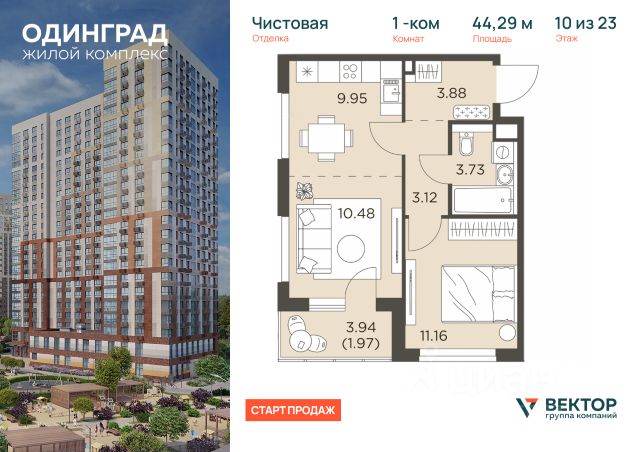Продается 1-комн. квартира площадью 39,2 кв.м на 10 этаже 21 этажного дома в ЖК "Союзный" от федерального девелопера ГК "Вектор".