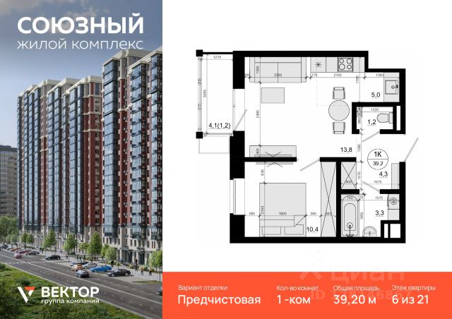 Продается 1-комн. квартира площадью 36,2 кв.м на 6 этаже 24 этажного дома в ЖК "Союзный" от федерального девелопера ГК "Вектор". Расположение, транспортная доступность Жилой комплекс "Союзный" — это квартал из 6 монолитных домов комфорт-класса высотой до 25 этажей, строящийся в 8-ом микрорайоне города Одинцово на улице Маковского. В продаже квартиры площадью от 37,2 до 88 кв. м, с потолками высотой 2,7 м, лоджиями, 2-мя санузлами в квартирах с 3-мя комнатами. Квартиры без отделки и с отделкой эконом, бизнес или комфорт класса. Квартал располагается на территории с отличной транспортной доступностью: - 8 км от МКАД; - 15 минут пешком до станции "Одинцово" МЦД-1; - рядом находится автобусная остановка, от которой можно доехать до метро "Парк Победы", "Киевская", "Юго-Западная"; На личном автотранспорте доехать от комплекса по Минскому шоссе к новой развязке с МКАД можно примерно за 20 минут. В качестве альтернативы можно выбрать Можайское шоссе. Даже в час пик передвигаться по нему можно со скоростью 50 км/ч. Кроме того, можно выбрать платную трассу Северный обход Одинцово. Путь от квартала до Северо-Западной хорды на автомобиле займет 25-35 минут, а до ТТК и Садового кольца - 1 час. В квартале запланировано строительство торгового центра, детского сада на 245 мест (сдача - 4 кв 2025 г.), многоуровневой открытой стоянки на 257 автомобилей, многоуровневого подземного паркинга, наземно-подземного паркинга с эксплуатируемой кровлей и других объектов. На внутренней территории квартала разместятся детский игровой комплекс с резиновым покрытием, спортплощадка, зоны отдыха для взрослых, деревья, кустарники и газоны. В шаговой доступности от ЖК "Союзный" располагаются школа, детский сад, профучилище, несколько ТЦ, кинотеатр "Юность", Ледовый дворец, сквер Союзный, Глазынинский пруд с качелями и площадкой для хоккея. В районе ЖК нет промышленных производств, а совсем близко начинаются лесные массивы, занимающие площадь свыше 70 000 га. Этот район считается одним из самых экологически чистых в Подмосковье.*