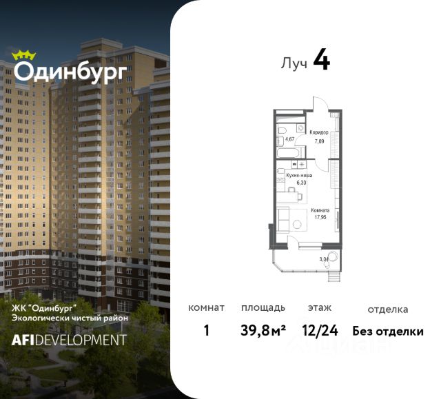 Продается 1-комн. квартира площадью 34,6 кв.м на 3 этаже 21 этажного дома в ЖК "Союзный" от федерального девелопера ГК "Вектор".