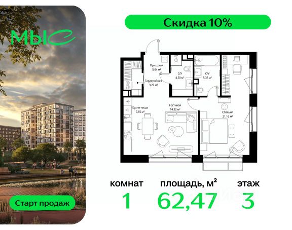 Прямая продажа от застройщика. Продаётся 1-комнатная квартира общей площадью 52.82 м² без отделки в премиальном жилом комплексе "МЫС" на 2-м этаже 12 этажного дома. Квартира расположена в корпусе "Волга". ЖК "МЫС" - идеальное место для тех, кто хочет объединить городскую жизнь с близостью к природе. Здесь каждый найдет формат жилья на свой вкус: многоквартирные и клубные дома для больших семей, ценящих приватность и простор, частные дома и таунхаусы для истинных фанатов загородной жизни, которые не готовы отказываться от городского комфорта. Расположение: - 2 мин. до скоростной трассы М1 и Минского шоссе; - 10 мин. до МКАД; - 20 мин. до делового центра "Москва-Сити"; - 25 мин. до ст. метро "Рассказовка"; - 28 мин. до аэропорта "Внуково". Благоустройство: - авторские лобби; - уютные зоны ожидания и библиотека; - велосипедные и лыжные маршруты; - собственная набережная и парк; - лаунж-зоны в окружении природы; - беседки у очага; - дворец спорта площадью 20 000 м²; - термальный комплекс с тремя бассейнами; - 4 теннисных и падел-корта; - 6 сквош-кортов; - многофункциональный спортзал; - скейт-парк; - просторная площадь для прогулок с фонтаном; - детский клуб с творческими секциями; - гастро-доминанта; - кафе у пруда, рестораны, ритейл. Окружение - соседство с лесным фондом; - школа на 1250 мест и 2 детских сада на 350 и 255 мест; - резерват "Долина реки Вяземки", Дубковский и Подушкинский леса, парк "Рассказовка", Мещерский парк.Компания MR Group предлагает своим клиентам специальные условия приобретения квартир в рамках программ ипотечного кредитования от банков-партнеров. 1-комнатная квартира в деревне Ликино Московской области.
