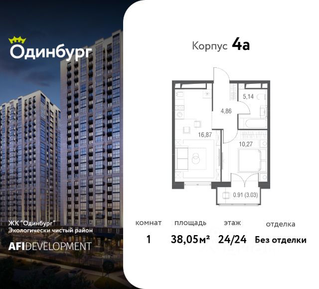 Предлагаем вашему вниманию уютную 1-комнатную квартиру общей площадью 37,99 кв.м на 24 этаже в новой очереди строительства ЖК "Одинбург". Этот обновленный проект от компании AFI Development включает в себя актуальные архитектурные решения и функциональные планировки. Для всех действует предложение от застройщика Назови свою скидку, подробности акции уточняйте у менеджеров отдела продаж. Новый Одинбург - это: • Возможность выбора между квартирами без отделки и с базовой отделкой (White Box). • Высокие потолки 2.8 м (в чистоте). • Просторные кухни-гостиные до 27 кв.м. • Балкон или лоджия в каждой квартире с панорамным остеклением. • Нишы для хранения вещей в прихожей и отдельные гардеробные. • Несколько санузлов для больших семей. • Живописный вид из окон на лес и городские пейзажи. И даже больше, чем комфорт-класс: • Монолитные дома с вентилируемым фасадом и облицовкой из декоративного камня. • Дизайнерская отделка мест общего пользования с мебелью и архитектурная подсветка фасадов. • На первых этажах предусмотрено помещение консьержа 24/7 и колясочная. • Развитая инфраструктура: в шаговой доступности расположено 6 детских садов, школы и лицей, магазины, кафе, салоны красоты и спортивные объекты. • Огороженная территория: двор без машин для безопасного отдыха и прогулок с детьми разных возрастов. • Машиноместа в отапливаемом подземном паркинге с доступом из лифта, в многоуровневом наземном паркинге и гостевые парковочные места. • Транспортная доступность: 7 минут до МЦД Одинцово, 10 минут до МКАД, 17 минут до центра Москвы по трассе М-1. Пространство для жизни: • Безопасность: наличие системы видеонаблюдения обеспечивает спокойствие и защиту вашего жилья. • Природа рядом: комплекс граничит с Подушкинским и Дубковским лесами, что позволяет наслаждаться свежим воздухом. • Большое количество спортивных объектов: ледовый дворец, волейбольный центр, центр горнолыжного спорта и школы Олимпийского резерва РФ и целый спортивный парк имени Героя России Ларисы Лазутиной. • Коммьюнити соседей со схожим образом жизни. Не упустите шанс стать владельцем квартиры в одном из самых перспективных жилых комплексов Подмосковья на выгодных условиях! Звоните прямо сейчас, чтобы узнать подробности и записаться на просмотр.