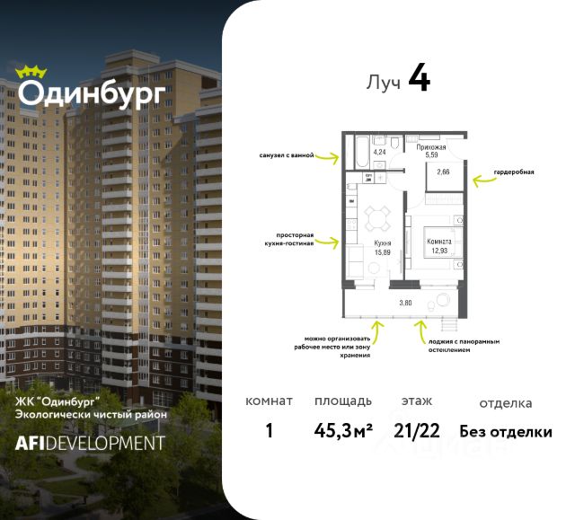 Предлагаем вашему вниманию уютную 1-комнатную квартиру общей площадью 45,4 кв.м на 19 этаже в новой очереди строительства ЖК "Одинбург". Этот обновленный проект от компании AFI Development включает в себя актуальные архитектурные решения и функциональные планировки. Для всех действует предложение от застройщика Назови свою скидку, подробности акции уточняйте у менеджеров отдела продаж. Новый Одинбург - это: • Возможность выбора между квартирами без отделки и с базовой отделкой (White Box). • Высокие потолки 2.8 м (в чистоте). • Просторные кухни-гостиные до 27 кв.м. • Балкон или лоджия в каждой квартире с панорамным остеклением. • Нишы для хранения вещей в прихожей и отдельные гардеробные. • Несколько санузлов для больших семей. • Живописный вид из окон на лес и городские пейзажи. И даже больше, чем комфорт-класс: • Монолитные дома с вентилируемым фасадом и облицовкой из декоративного камня. • Дизайнерская отделка мест общего пользования с мебелью и архитектурная подсветка фасадов. • На первых этажах предусмотрено помещение консьержа 24/7 и колясочная. • Развитая инфраструктура: в шаговой доступности расположено 6 детских садов, школы и лицей, магазины, кафе, салоны красоты и спортивные объекты. • Огороженная территория: двор без машин для безопасного отдыха и прогулок с детьми разных возрастов. • Машиноместа в отапливаемом подземном паркинге с доступом из лифта, в многоуровневом наземном паркинге и гостевые парковочные места. • Транспортная доступность: 7 минут до МЦД Одинцово, 10 минут до МКАД, 17 минут до центра Москвы по трассе М-1. Пространство для жизни: • Безопасность: наличие системы видеонаблюдения обеспечивает спокойствие и защиту вашего жилья. • Природа рядом: комплекс граничит с Подушкинским и Дубковским лесами, что позволяет наслаждаться свежим воздухом. • Большое количество спортивных объектов: ледовый дворец, волейбольный центр, центр горнолыжного спорта и школы Олимпийского резерва РФ и целый спортивный парк имени Героя России Ларисы Лазутиной. • Коммьюнити соседей со схожим образом жизни. Не упустите шанс стать владельцем квартиры в одном из самых перспективных жилых комплексов Подмосковья на выгодных условиях! Звоните прямо сейчас, чтобы узнать подробности и записаться на просмотр. Купить 1-комнатную квартиру в новостройке без отделки в Одинцово.