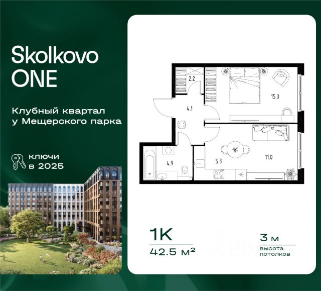 Прямая продажа от застройщика! Жилой комплекс в двух шагах от Мещерского парка Квартира в корпусе 4 | 42,5 м² | 2 этаж из 9 | Дом сдан Откройте для себя новый уровень жизни в ЖК "Skolkovo ONE" — единственном жилом комплексе с собственным приватным выходом в Мещерский парк. Преимущества ЖК "Skolkovo ONE": Эксклюзивная локация: Живите в гармонии с природой, не отказываясь от ритма мегаполиса: Мещерский парк (465 га) в двух шагах от дома — ваши персональные "легкие" в черте города. 5 минут до Инновационного центра "Сколково" — соседство с технологиями будущего. 20 минут до Москва-Сити — идеальный баланс уединения и доступности. 10 минут до метро "Озерная", "Говорово" Бизнес-класс в английском стиле: Клубный формат в духе английской архитектуры с панорамным остеклением и французскими балконами. Комфортная этажность, 9 этажей. Фасады из натуральных материалов. Smart-планировки: мастер-спальни, два санузла, гардеробные. Панорамные виды на лес и парк из окон. Квартиры без отделки — реализуйте собственный стиль и воплотите любые дизайнерские решения. Комфорт и сервис: Консьерж-сервис, дизайнерские лобби с зонами для работы и отдыха. Дендропарк во дворе, детская инфраструктура и продуманные общественные пространства. ЖК "Skolkovo ONE" — клубный жилой комплекс для тех, кто ценит баланс между динамикой мегаполиса и уединением природы. Узнайте подробности и забронируйте свою квартиру у наших менеджеров!