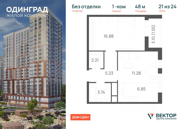 Прямая продажа от застройщика. Продается 1-комн. квартира площадью 36,09 кв.м на 3 этаже 23 этажного дома в ЖК "Одинград" от федерального девелопера ГК "Вектор". Жилой комплекс "Одинград. Квартал "Семейный"" состоит из 11 монолитных корпусов с авторской архитектурой. Панорамные лоджии позволяют любоваться рассветами и закатами, а квартиры предлагаются с чистовой отделкой, разнообразными планировками и площадью от 20 до 99 кв. м. Высота потолков варьируется от 2,7 до 3,6 м. Для семейного отдыха и активного времяпрепровождения на территории комплекса создан ландшафтный парк площадью 4,8 га. Внутренний двор "Фабрика детства" включает зоны воркаута, игровые и спортивные площадки для детей всех возрастов, гамаки, лежаки, велосипедные и беговые дорожки. Двор полностью свободен от автомобилей, а игровое оборудование рассчитано на самостоятельное использование. В квартале предусмотрена развитая инфраструктура: три детских сада и собственная школа. Для автомобилей организован наземный паркинг с круглосуточным видеонаблюдением. Природные объекты площадью 2 тыс. га находятся в шаговой доступности, здесь можно гулять, кататься на велосипеде, роликах или лыжах, проводить выходные с семьей на свежем воздухе. Комплекс удобно расположен с точки зрения транспорта. Остановка общественного транспорта находится всего в 100 м от домов, а планируемый выезд на платную скоростную трассу М-1 позволит за 15 минут добраться до Москвы и за 30 минут — до центра столицы. Архитектурный проект разработан бюро Tikkanen в финском стиле. Входные группы оборудованы зонами отдыха, предусмотрены места для колясок и спортивного инвентаря. В подъездах установлены бесшумные скоростные лифты, обеспечивающие комфорт каждому жителю.