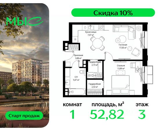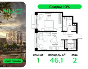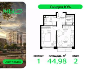 Прямая продажа от застройщика. Продаётся 1-комнатная квартира общей площадью 43.03 м² без отделки в премиальном жилом комплексе "МЫС" на 7-м этаже 12 этажного дома. Квартира расположена в корпусе "Волга". Проект МЫС — это, прежде всего, идеальное место для семей. В рамках проекта построят государственную школу, два детских сада и дворец спорта площадью 20 000 м2 с термальным комплексом, выплывным бассейном, фитнес-залом, теннисными, сквош и падел кортами и секциями для детей. На территории площадью, сравнимой с тремя парками Зарядье, появятся кафе и рестораны, пруд с набережной, спортивные и детские площадки, скейт-парк, лыжные и веломаршруты. Расположение: - 2 минуты до скоростной трассы М1 и Минского шоссе; - 10 минут до МКАД; - 15 минут до МЦД Лесной Городок - 20 минут до делового центра "Москва-Сити"; - 28 минут до аэропорта "Внуково". Благоустройство: - велосипедные и лыжные маршруты; - собственная набережная и парк; - лаунж-зоны в окружении природы; - беседки у очага; - дворец спорта площадью 20 000 м²; - термальный комплекс с тремя бассейнами; - 4 теннисных и падел-корта; - 6 сквош-кортов; - многофункциональный спортзал; - скейт-парк; - просторная площадь для прогулок с фонтаном; - детский клуб с творческими секциями; - гастро-доминанта; - кафе у пруда, рестораны, ритейл. Окружение - соседство с лесным фондом; - школа на 1250 мест и 2 детских сада на 350 и 255 мест; - Дубковский и Подушкинский леса, парк "Рассказовка", Мещерский парк.Действуют специальные условия при 100% оплате, подробности уточняйте у менеджера в офисе продаж. Купить 1-комнатную квартиру с отделкой от застройщика в городском округе Одинцовском Московской области.