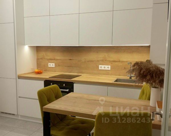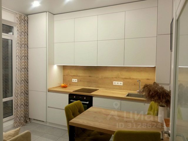 Кухня решит все задачи с приготовлением и хранением еды, мойкой посуды. Здесь есть посудомоечная машина, варочная панель на 3 конфорки, вытяжка, духовой шкаф, холодильник. Две рабочие поверхности, на которые можно поставить кухонную технику- розетки предусмотрены.