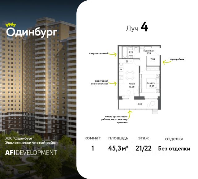 Предлагаем вашему вниманию уютную 1-комнатную квартиру общей площадью 45,4 кв.м на 19 этаже в новой очереди строительства ЖК "Одинбург". Этот обновленный проект от компании AFI Development включает в себя актуальные архитектурные решения и функциональные планировки. Для всех действует предложение от застройщика Назови свою скидку, подробности акции уточняйте у менеджеров отдела продаж. Новый Одинбург - это: • Возможность выбора между квартирами без отделки и с базовой отделкой (White Box). • Высокие потолки 2.8 м (в чистоте). • Просторные кухни-гостиные до 27 кв.м. • Балкон или лоджия в каждой квартире с панорамным остеклением. • Нишы для хранения вещей в прихожей и отдельные гардеробные. • Несколько санузлов для больших семей. • Живописный вид из окон на лес и городские пейзажи. И даже больше, чем комфорт-класс: • Монолитные дома с вентилируемым фасадом и облицовкой из декоративного камня. • Дизайнерская отделка мест общего пользования с мебелью и архитектурная подсветка фасадов. • На первых этажах предусмотрено помещение консьержа 24/7 и колясочная. • Развитая инфраструктура: в шаговой доступности расположено 6 детских садов, школы и лицей, магазины, кафе, салоны красоты и спортивные объекты. • Огороженная территория: двор без машин для безопасного отдыха и прогулок с детьми разных возрастов. • Машиноместа в отапливаемом подземном паркинге с доступом из лифта, в многоуровневом наземном паркинге и гостевые парковочные места. • Транспортная доступность: 7 минут до МЦД Одинцово, 10 минут до МКАД, 17 минут до центра Москвы по трассе М-1. Пространство для жизни: • Безопасность: наличие системы видеонаблюдения обеспечивает спокойствие и защиту вашего жилья. • Природа рядом: комплекс граничит с Подушкинским и Дубковским лесами, что позволяет наслаждаться свежим воздухом. • Большое количество спортивных объектов: ледовый дворец, волейбольный центр, центр горнолыжного спорта и школы Олимпийского резерва РФ и целый спортивный парк имени Героя России Ларисы Лазутиной. • Коммьюнити соседей со схожим образом жизни. Не упустите шанс стать владельцем квартиры в одном из самых перспективных жилых комплексов Подмосковья на выгодных условиях! Звоните прямо сейчас, чтобы узнать подробности и записаться на просмотр. Купить 1-комнатную квартиру в Одинцово.