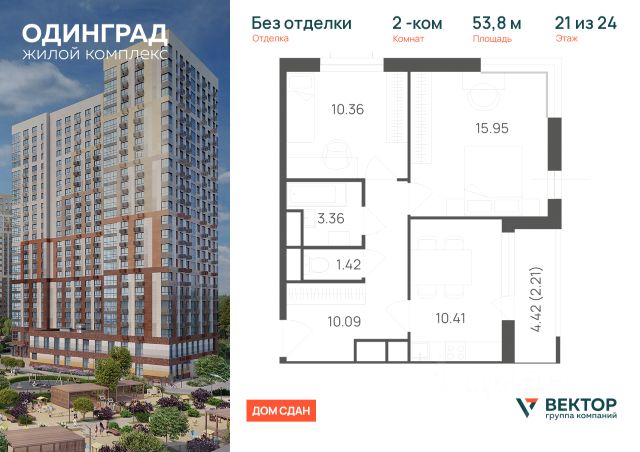 Прямая продажа от застройщика. Продается 2-комн. квартира площадью 52,2 кв.м на 22 этаже 24 этажного дома в ЖК "Одинград" от федерального девелопера ГК "Вектор". Жилой комплекс "Одинград. Квартал "Семейный"" состоит из 11 монолитных корпусов с авторской архитектурой. Панорамные лоджии позволяют любоваться рассветами и закатами, а квартиры предлагаются с чистовой отделкой, разнообразными планировками и площадью от 20 до 99 кв. м. Высота потолков варьируется от 2,7 до 3,6 м. Для семейного отдыха и активного времяпрепровождения на территории комплекса создан ландшафтный парк площадью 4,8 га. Внутренний двор "Фабрика детства" включает зоны воркаута, игровые и спортивные площадки для детей всех возрастов, гамаки, лежаки, велосипедные и беговые дорожки. Двор полностью свободен от автомобилей, а игровое оборудование рассчитано на самостоятельное использование. В квартале предусмотрена развитая инфраструктура: три детских сада и собственная школа. Для автомобилей организован наземный паркинг с круглосуточным видеонаблюдением. Природные объекты площадью 2 тыс. га находятся в шаговой доступности, здесь можно гулять, кататься на велосипеде, роликах или лыжах, проводить выходные с семьей на свежем воздухе. Комплекс удобно расположен с точки зрения транспорта. Остановка общественного транспорта находится всего в 100 м от домов, а планируемый выезд на платную скоростную трассу М-1 позволит за 15 минут добраться до Москвы и за 30 минут — до центра столицы. Архитектурный проект разработан бюро Tikkanen в финском стиле. Входные группы оборудованы зонами отдыха, предусмотрены места для колясок и спортивного инвентаря. В подъездах установлены бесшумные скоростные лифты, обеспечивающие комфорт каждому жителю.