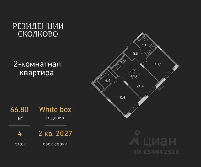 Продается двухкомнатная квартира в девятиэтажном монолитном доме жилого комплекса "Резиденции Сколково". Общая площадь квартиры - 57,5 кв. м, этаж 4 из 9. Срок сдачи - 3 квартал 2026 года. ЖК "Резиденции Сколково" - это современный проект бизнес-класса, расположенный в престижном районе Сколково, у западной границы Москвы. Транспортная доступность: - 0 км от МКАД - 10 минут на личном авто до метро "Озёрная" Солнцевской линии - 15 минут на личном авто до Москва-Сити по Кутузовскому проспекту - 20 минут на личном авто до центра по проспекту Генерала Дорохова - 24 минут на личном авто до центра по Мичуринскому проспекту Безопасность: Огороженная, закрытая территория, круглосуточное видеонаблюдение, контроль доступа во внутренний двор. Благоустройство и инфраструктура: Масштабное озеленение в концепции "двора-парка" и множество площадок отдыха для взрослых и детей. В 5 минутах ходьбы расположен Мещерский лесопарк. В жилом комплексе уже построены и работают 2 муниципальных детских сада с бассейном, планируется строительство 1 школы. В непосредственной близости - частные и муниципальные детские сады и школы, кафе и рестораны, продуктовые магазины, салоны красоты и другие готовые объекты городской инфраструктуры. Авторская архитектура: Авторская концепция архитектуры, входные группы на уровне земли. Для удобства жителей на первых этажах предусмотрены помещения для колясок и на -1 этажах для хранения велосипедов.