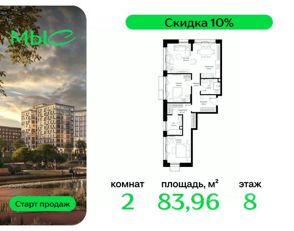 Прямая продажа от застройщика. Продаётся 2-комнатная квартира общей площадью 83.10 м² без отделки в премиальном жилом комплексе "МЫС" на 8-м этаже 12 этажного дома. Квартира расположена в корпусе "Волга". Проект МЫС — это, прежде всего, идеальное место для семей. В рамках проекта построят государственную школу, два детских сада и дворец спорта площадью 20 000 м2 с термальным комплексом, выплывным бассейном, фитнес-залом, теннисными, сквош и падел кортами и секциями для детей. На территории площадью, сравнимой с тремя парками Зарядье, появятся кафе и рестораны, пруд с набережной, спортивные и детские площадки, скейт-парк, лыжные и веломаршруты. Расположение: - 2 минуты до скоростной трассы М1 и Минского шоссе; - 10 минут до МКАД; - 15 минут до МЦД Лесной Городок - 20 минут до делового центра "Москва-Сити"; - 28 минут до аэропорта "Внуково". Благоустройство: - велосипедные и лыжные маршруты; - собственная набережная и парк; - лаунж-зоны в окружении природы; - беседки у очага; - дворец спорта площадью 20 000 м²; - термальный комплекс с тремя бассейнами; - 4 теннисных и падел-корта; - 6 сквош-кортов; - многофункциональный спортзал; - скейт-парк; - просторная площадь для прогулок с фонтаном; - детский клуб с творческими секциями; - гастро-доминанта; - кафе у пруда, рестораны, ритейл. Окружение - соседство с лесным фондом; - школа на 1250 мест и 2 детских сада на 350 и 255 мест; - Дубковский и Подушкинский леса, парк "Рассказовка", Мещерский парк.Действуют специальные условия при 100% оплате, подробности уточняйте у менеджера в офисе продаж.