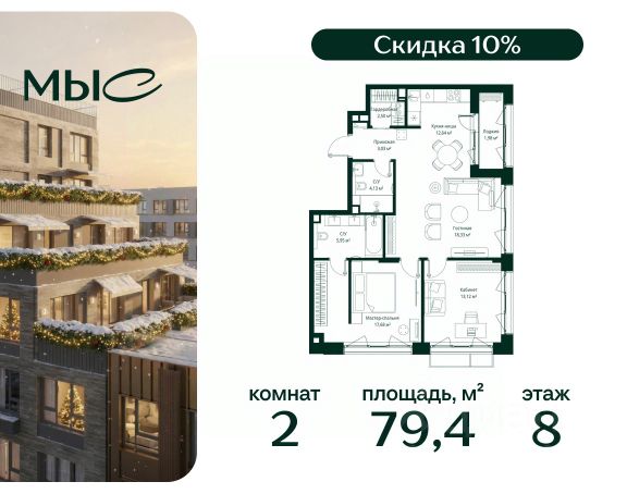 Прямая продажа от застройщика. Продаётся 2-комнатная квартира общей площадью 80.50 м² без отделки в премиальном жилом комплексе "МЫС" на 8-м этаже 12 этажного дома. Квартира расположена в корпусе "Сибирь". Проект МЫС — это, прежде всего, идеальное место для семей. В рамках проекта построят государственную школу, два детских сада и дворец спорта площадью 20 000 м2 с термальным комплексом, выплывным бассейном, фитнес-залом, теннисными, сквош и падел кортами и секциями для детей. На территории площадью, сравнимой с тремя парками Зарядье, появятся кафе и рестораны, пруд с набережной, спортивные и детские площадки, скейт-парк, лыжные и веломаршруты. Расположение: - 2 минуты до скоростной трассы М1 и Минского шоссе; - 10 минут до МКАД; - 15 минут до МЦД Лесной Городок - 20 минут до делового центра "Москва-Сити"; - 28 минут до аэропорта "Внуково". Благоустройство: - велосипедные и лыжные маршруты; - собственная набережная и парк; - лаунж-зоны в окружении природы; - беседки у очага; - дворец спорта площадью 20 000 м²; - термальный комплекс с тремя бассейнами; - 4 теннисных и падел-корта; - 6 сквош-кортов; - многофункциональный спортзал; - скейт-парк; - просторная площадь для прогулок с фонтаном; - детский клуб с творческими секциями; - гастро-доминанта; - кафе у пруда, рестораны, ритейл. Окружение - соседство с лесным фондом; - школа на 1250 мест и 2 детских сада на 350 и 255 мест; - Дубковский и Подушкинский леса, парк "Рассказовка", Мещерский парк. Действуют специальные условия при 100% оплате, подробности уточняйте у менеджера в офисе продаж.
