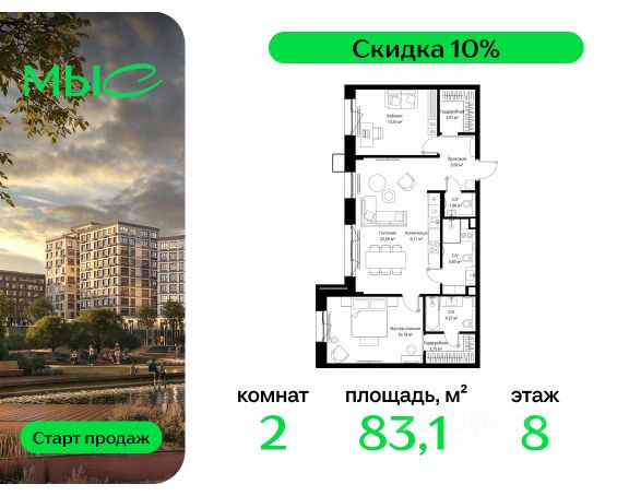 Прямая продажа от застройщика. Продаётся 2-комнатная квартира общей площадью 83.10 м² без отделки в премиальном жилом комплексе "МЫС" на 8-м этаже 12 этажного дома. Квартира расположена в корпусе "Волга". Проект МЫС — это, прежде всего, идеальное место для семей. В рамках проекта построят государственную школу, два детских сада и дворец спорта площадью 20 000 м2 с термальным комплексом, выплывным бассейном, фитнес-залом, теннисными, сквош и падел кортами и секциями для детей. На территории площадью, сравнимой с тремя парками Зарядье, появятся кафе и рестораны, пруд с набережной, спортивные и детские площадки, скейт-парк, лыжные и веломаршруты. Расположение: - 2 минуты до скоростной трассы М1 и Минского шоссе; - 10 минут до МКАД; - 15 минут до МЦД Лесной Городок - 20 минут до делового центра "Москва-Сити"; - 28 минут до аэропорта "Внуково". Благоустройство: - велосипедные и лыжные маршруты; - собственная набережная и парк; - лаунж-зоны в окружении природы; - беседки у очага; - дворец спорта площадью 20 000 м²; - термальный комплекс с тремя бассейнами; - 4 теннисных и падел-корта; - 6 сквош-кортов; - многофункциональный спортзал; - скейт-парк; - просторная площадь для прогулок с фонтаном; - детский клуб с творческими секциями; - гастро-доминанта; - кафе у пруда, рестораны, ритейл. Окружение - соседство с лесным фондом; - школа на 1250 мест и 2 детских сада на 350 и 255 мест; - Дубковский и Подушкинский леса, парк "Рассказовка", Мещерский парк.Действуют специальные условия при 100% оплате, подробности уточняйте у менеджера в офисе продаж. 2-комнатная квартира в ипотеку в деревне Ликино Московской области.