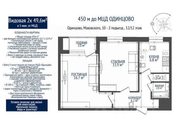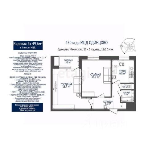 Лучший дом в Одинцово напротив школы с подземным паркингом, построенный квалифицированными строителями! Лучший вид открывается из квартиры с 24 этажа на голубое небо в сторону Москвы. В квартире на площади 78,3 кв.м. 2 просторные спальни, кухня-гостиная с лоджией, раздельный санузел. В квартире уже возведены перегородки, проведена разводка отопления, электрики, установлены системы защиты от протечек Neptun. Над квартирой расположен полноценный технический этаж. В доме презентабельная входная группа с консьержем, с установленными кофе-аппаратом, системой розлива питьевой воды, четыре лифта, широкие коридоры. Закрытая придомовая территория с детской и спортивной площадками, игровое поле, спортивные тренажеры, столы для пинг-понга. Обжитой район, до станции Одинцово 11 минут пешком, в шаговой доступности магазины, аптеки, поликлиника, школа 3, отделение Сбербанка и т.д. Заинтересовал объект? Пишите или звоните нам в любое время! Оставьте в сообщении свой номер телефона для обратной связи! Мы перезвоним вам в течение дня. Наше агентство - прямой представитель собственника, поэтому мы сможем ответить на все ваши вопросы. Каждому клиенту мы гарантируем полное юридическое сопровождение. В удобное для вас время организуем показ! Купить 2-комнатную квартиру на улице Маковского в городе Одинцово.
