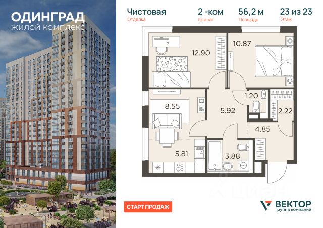 Прямая продажа от застройщика. Продается 2-комн. квартира площадью 55 кв.м на 24 этаже 24 этажного дома в ЖК "Одинград" от федерального девелопера ГК "Вектор". Жилой комплекс "Одинград. Квартал "Семейный"" состоит из 11 монолитных корпусов с авторской архитектурой. Панорамные лоджии позволяют любоваться рассветами и закатами, а квартиры предлагаются с чистовой отделкой, разнообразными планировками и площадью от 20 до 99 кв. м. Высота потолков варьируется от 2,7 до 3,6 м. Для семейного отдыха и активного времяпрепровождения на территории комплекса создан ландшафтный парк площадью 4,8 га. Внутренний двор "Фабрика детства" включает зоны воркаута, игровые и спортивные площадки для детей всех возрастов, гамаки, лежаки, велосипедные и беговые дорожки. Двор полностью свободен от автомобилей, а игровое оборудование рассчитано на самостоятельное использование. В квартале предусмотрена развитая инфраструктура: три детских сада и собственная школа. Для автомобилей организован наземный паркинг с круглосуточным видеонаблюдением. Природные объекты площадью 2 тыс. га находятся в шаговой доступности, здесь можно гулять, кататься на велосипеде, роликах или лыжах, проводить выходные с семьей на свежем воздухе. Комплекс удобно расположен с точки зрения транспорта. Остановка общественного транспорта находится всего в 100 м от домов, а планируемый выезд на платную скоростную трассу М-1 позволит за 15 минут добраться до Москвы и за 30 минут — до центра столицы. Архитектурный проект разработан бюро Tikkanen в финском стиле. Входные группы оборудованы зонами отдыха, предусмотрены места для колясок и спортивного инвентаря. В подъездах установлены бесшумные скоростные лифты, обеспечивающие комфорт каждому жителю.