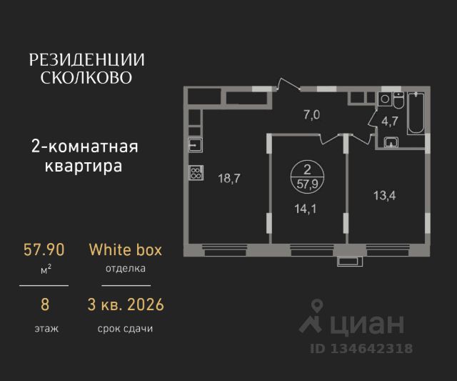 Продается двухкомнатная квартира в девятиэтажном монолитном доме жилого комплекса "Резиденции Сколково". Общая площадь квартиры - 78,9 кв. м, этаж 1 из 9. Срок сдачи - 2 квартал 2027 года. Новая резиденция 2.2 состоит из 6 секций: - 5 секция с отделкой White Box с возможностью повышения до дизайнерской за дополнительную плату - Остальные секции - без отделки ЖК "Резиденции Сколково" - это современный проект бизнес-класса, расположенный в престижном районе Сколково, у западной границы Москвы. ТРАНСПОРТНАЯ ДОСТУПНОСТЬ: - 0 км от МКАД - 10 минут на личном авто до метро "Озёрная" Солнцевской линии - 15 минут на личном авто до Москва-Сити по Кутузовскому проспекту - 20 минут на личном авто до центра по проспекту Генерала Дорохова - 24 минут на личном авто до центра по Мичуринскому проспекту ОСОБЕННОСТИ РЕЗИДЕНЦИИ 2.2: - панорамное остекление - французские балконы - сквозные входные группы с безбарьерным входом - стильная мягкая зона ожидания - колясочные во входных группах на 1 этажах - входная группа 1 этажа каждой секции оснащена санузлом - паркинг на -1 этажах - по 2 лифта: 1 пассажирский, 1 грузопассажирский ПРИВАТНОСТЬ: Огороженная, закрытая территория, круглосуточное видеонаблюдение, контроль доступа во внутренний двор. БЛАГОУСТРОЙСТВО И ИНФРАСТРУКТУРА: Масштабное озеленение в концепции "двора-парка" и множество площадок отдыха для взрослых и детей. В 5 минутах ходьбы расположен Мещерский лесопарк. В жилом комплексе уже построены и работают 2 муниципальных детских сада с бассейном, школа на этапе строительства. В непосредственной близости - частные и муниципальные детские сады и школы, кафе и рестораны, продуктовые магазины, салоны красоты и другие готовые объекты городской инфраструктуры. *В 3D туре представлена отделка "Фрунзуская классика. Business Plus"