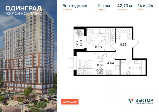 Продается 2-комн. квартира площадью 50,8 кв.м на 6 этаже 21 этажного дома в ЖК "Союзный" от федерального девелопера ГК "Вектор".