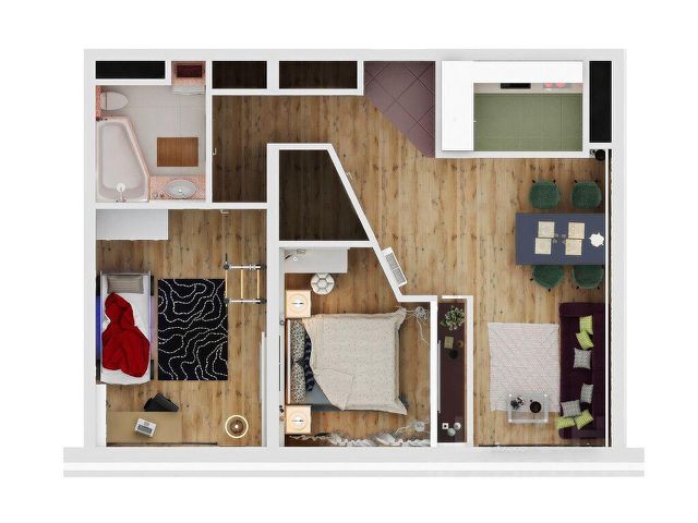 Планировка: кухня-гостиная, 2 спальни, одна из них детская, гардеробная комната, санузел совмещенный, прихожая.