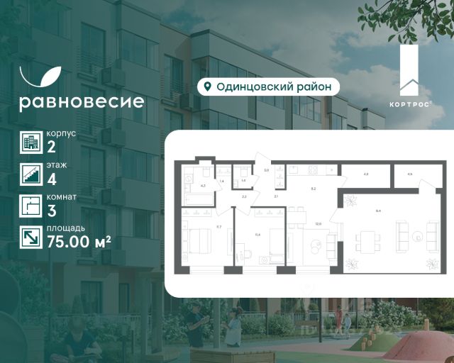 Указанная акционная стоимость доступна при 100% оплате или ипотеке без субсидирования. Цена действует до 31.12.2025 23:59:00. Стоимость без акции 12693210. Продаётся квартира с 3 комнатами общей площадью 52.30 кв. метров на 4 этаже жилого квартала комфорт-класса "Равновесие". Срок сдачи: 2 кв. 2024 На территории комплекса будет возведен детский сад на 360 мест, а на первых этажах жилых домов откроются кафе, магазины и все необходимое для удобства жителей. Локация "Равновесия" выделяется среди других пригородных ЖК разнообразием быстрых маршрутов до Москвы. Для автомобилистов преимуществом станут удобные выезды на Можайское шоссе, Рублёво-Успенское шоссе, Минское шоссе с платной трассой и другие. Также в пешей доступности находятся две ж/д станции — "Жаворонки" и "Здравница". Дорога на электропоезде до делового центра "Москва-Сити" составит всего 35 минут. Особенности ЖК: - Малоэтажная застройка: 4-6 этажей; - Благоустроенный пешеходный бульвар; - Пространства для отдыха и спорта; - Квартиры с террасами на последних этажах; - Квартиры с отдельным входом на первых этажах; - Внутренняя территория квартала свободна от машин; - Безбарьерная среда; - Помещения для хранения детских колясок и спортивного инвентаря.