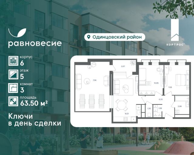 Указанная акционная стоимость доступна при 100% оплате или ипотеке без субсидирования. Цена действует до 31.12.2025 23:59:00. Стоимость без акции 14029895. Продаётся квартира с 3 комнатами общей площадью 58.30 кв. метров на 2 этаже жилого квартала комфорт-класса "Равновесие". Срок сдачи: 4 кв. 2026 На территории комплекса будет возведен детский сад на 360 мест, а на первых этажах жилых домов откроются кафе, магазины и все необходимое для удобства жителей. Локация "Равновесия" выделяется среди других пригородных ЖК разнообразием быстрых маршрутов до Москвы. Для автомобилистов преимуществом станут удобные выезды на Можайское шоссе, Рублёво-Успенское шоссе, Минское шоссе с платной трассой и другие. Также в пешей доступности находятся две ж/д станции — "Жаворонки" и "Здравница". Дорога на электропоезде до делового центра "Москва-Сити" составит всего 35 минут. Особенности ЖК: - Малоэтажная застройка: 4-6 этажей; - Благоустроенный пешеходный бульвар; - Пространства для отдыха и спорта; - Квартиры с террасами на последних этажах; - Квартиры с отдельным входом на первых этажах; - Внутренняя территория квартала свободна от машин; - Безбарьерная среда; - Помещения для хранения детских колясок и спортивного инвентаря.
