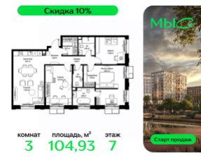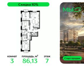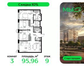 Прямая продажа от застройщика. Продаётся 3-к квартира общей площадью 91.55 м² без отделки в премиальном жилом комплексе "МЫС" на 2-м этаже 12 этажного дома. Квартира расположена в корпусе "Сибирь". ЖК "МЫС" - идеальное место для тех, кто хочет объединить городскую жизнь с близостью к природе. Здесь каждый найдет формат жилья на свой вкус: многоквартирные и клубные дома для больших семей, ценящих приватность и простор, частные дома и таунхаусы для истинных фанатов загородной жизни, которые не готовы отказываться от городского комфорта. Расположение: - 2 мин. до скоростной трассы М1 и Минского шоссе; - 10 мин. до МКАД; - 20 мин. до делового центра "Москва-Сити"; - 25 мин. до ст. метро "Рассказовка"; - 28 мин. до аэропорта "Внуково". Благоустройство: - авторские лобби; - уютные зоны ожидания и библиотека; - велосипедные и лыжные маршруты; - собственная набережная и парк; - лаунж-зоны в окружении природы; - беседки у очага; - дворец спорта площадью 20 000 м²; - термальный комплекс с тремя бассейнами; - 4 теннисных и падел-корта; - 6 сквош-кортов; - многофункциональный спортзал; - скейт-парк; - просторная площадь для прогулок с фонтаном; - детский клуб с творческими секциями; - гастро-доминанта; - кафе у пруда, рестораны, ритейл. Окружение - соседство с лесным фондом; - школа на 1250 мест и 2 детских сада на 350 и 255 мест; - резерват "Долина реки Вяземки", Дубковский и Подушкинский леса, парк "Рассказовка", Мещерский парк.Компания MR Group предлагает своим клиентам специальные условия приобретения квартир в рамках программ ипотечного кредитования от банков-партнеров. Продам 3-комнатную квартиру с отделкой от застройщика в городском округе Одинцовском Московской области.