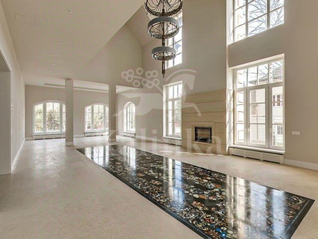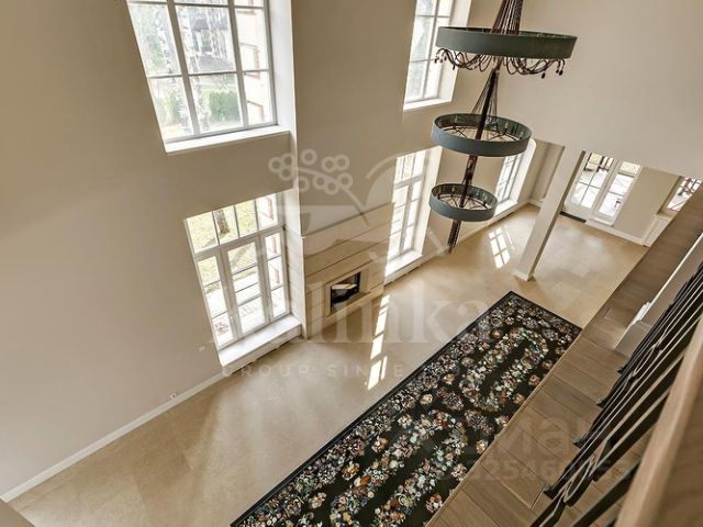 высокие потолки, высокие двери, гостиная со вторым светом, камин, сочетание натуральных материалов из камня, дерева, различных систем и форм освещения, элементов декора современного и классического стиля, стильная современная и классическая мебель, отделка лестницы и пола массив дуба, инженерная доска, отделка потолков лепнина, подоконники, камин, элементы с/у мрамор, вся мебель выполнена на заказ из дорогих материалов.