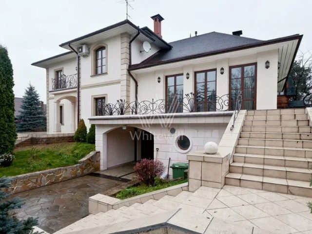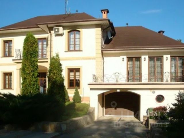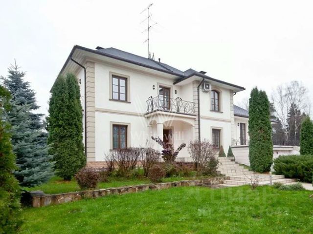 Дом, выполненный в классическом стиле, с балконами, просторной террасой, широкой лестницей ведущей на террасу, расположен на участке среди величественных туй, голубых елей, красивых лиственных деревьев и декоративных кустарников, живописных цветников.