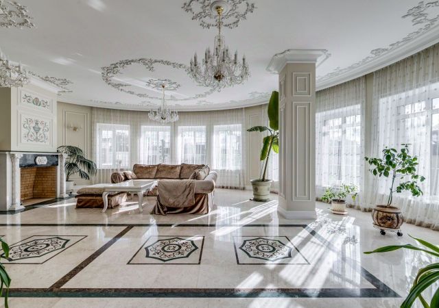 Потолок: роспись, натуральный гипс. Подоконники мраморные. Окна двойные стеклопакеты.