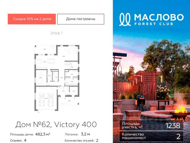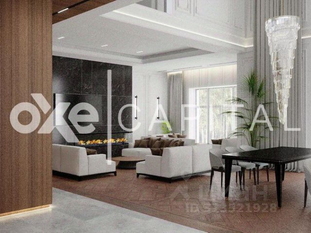 В основном доме: 4 спальни с ванными комнатами и гардеробными, просторная гостиная с эркерной зоной и дровяным камином, столовая с панорамным остеклением и отдельная кухня. Дом предлагается под чистовую отделку.