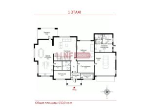 Прихожая (6,7), холл (46,8), гостиная (49,6), столовая с выходом в сад (27,4), кухня (18,4), гостевая спальня (18,5), гостевой с/у (2,2), спа-зона с комнатой отдыха (45,9), сауной (8,3), бассейном (119,4), душевой (2,8) и с/у (2,9), прихожая (11,5).