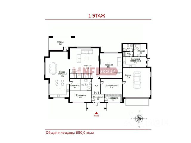 Квартира для персонала с отдельным входом: прихожая (4,3), 2 комнаты (15,4 + 8,2), с/у (4,5). Прочие помещения: прихожая (10,5), гараж на 2 м/м (42,6), с/у (6).