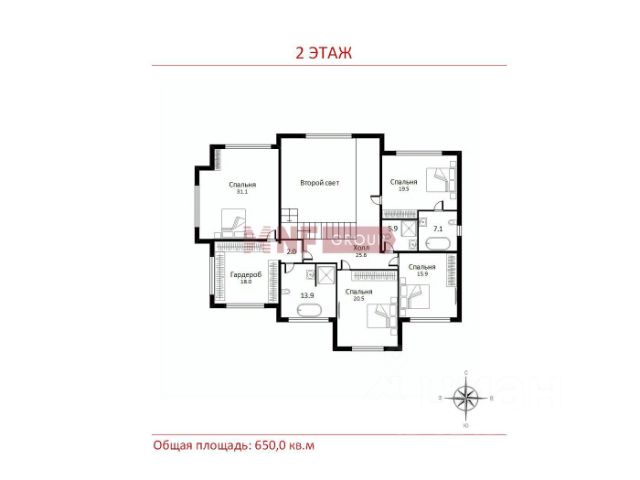 Мастер спальня (20) с ванной комнатой (9,2) и гардеробной (9,2).