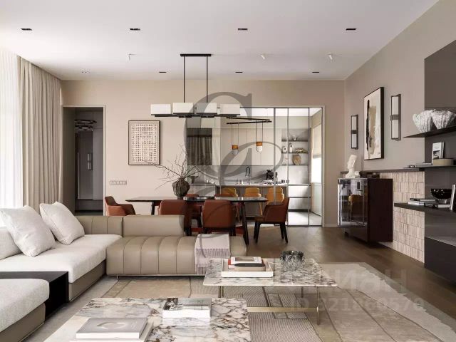 В отделке используется дерево, крупноформатный испанский керамогранит, колотый натуральный камень (акцентные стены в гостиной), кварцит (столешница на кухне).