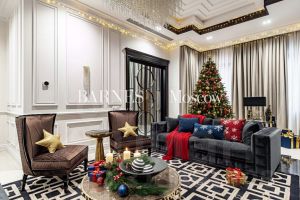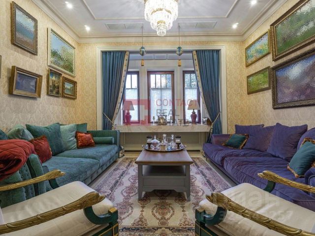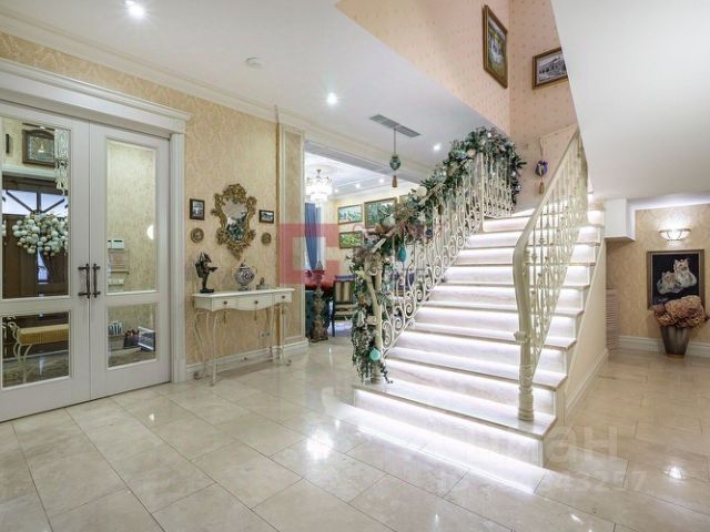 высокие потолки, высокие двери, гостиная со вторым светом, камин, сочетание натуральных материалов из камня, дерева, различных систем и форм освещения, элементов декора современного и классического стиля, стильная современная и классическая мебель, отделка лестницы и пола массив дуба, инженерная доска, отделка потолков лепнина, подоконники, камин, элементы с/у мрамор, вся мебель выполнена на заказ из дорогих материалов.