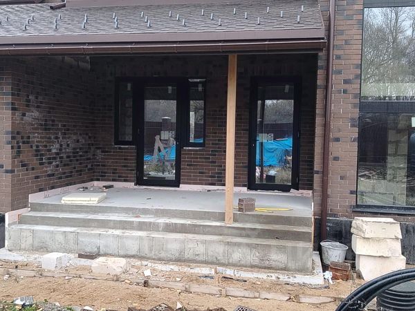 Сзади дома площадка из брусчатки для барбекю.