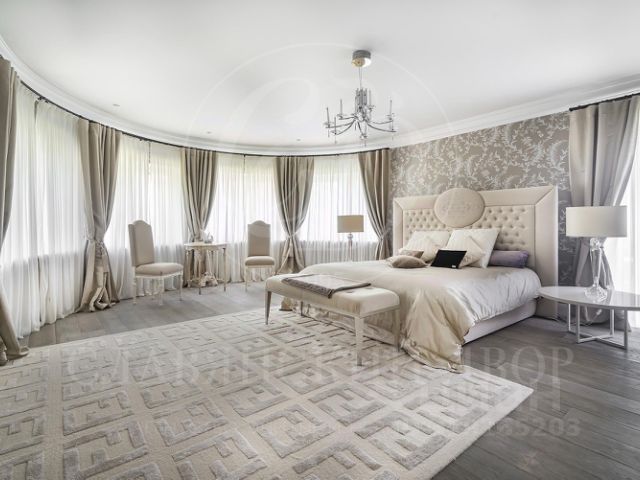 В интерьере использованы высококачественные материалы, такие как дерево, испанский керамогранит и мрамор. В доме предусмотрены теплые полы. Планировка включает спа-зону с бассейном (8 метров с противотоком), сауну и душевые, кабинет, просторную гостиную с камином, кухню-столовую с застекленной террасой, четыре спальни, пять ванных комнат и домашний кинотеатр с зоной отдыха.