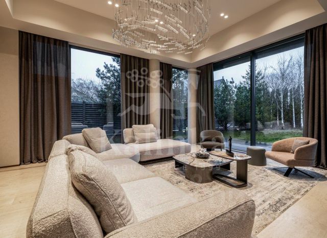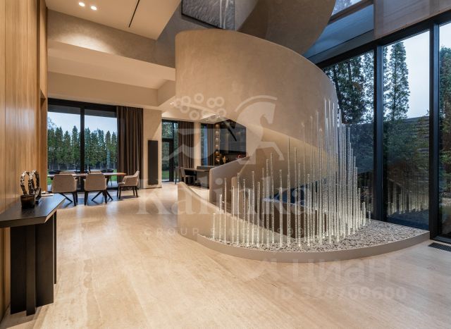 В доме: 4 спальни с ванными и гардеробными, гостиная-столовая, кухня, хобби-комната 50 кв.м, двухуровневая спа-зона с хаммамом, сауной и джакузи, гараж на 2 м/м с зарядкой для электроавтомобиля и помещением для водителя, котельная, отдельный блок персонала с профессиональной кухней в цоколе.