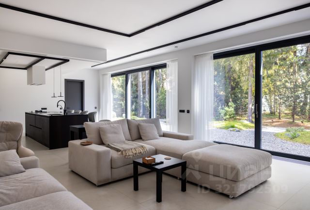 Основной дом 575 кв.м с современной архитектурой, панорамными окнами и высокими потолками: 4 метра на первом этаже и 4,5 на втором. Подготовлен под чистовую отделку. Внутренние стены оштукатурены, сделана разводка отопления, дом уже теплый.