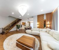 Очень хорошая планировка: ядром дома является большая кухня-гостиная со вторым светом (высота 9 м), в доме 5 спален(комнат), конфигурацию которых можно изменить на свое усмотрение (кабинет, игровая и пр.), теплый гараж на 2 авто, квартира для персонала над гаражом, веранда с камином, барбекю зона, кострище и т.д. На участке ландшафтный дизайн, роскошный в любое время года. Эксклюзивная мебель и предметы интерьера.