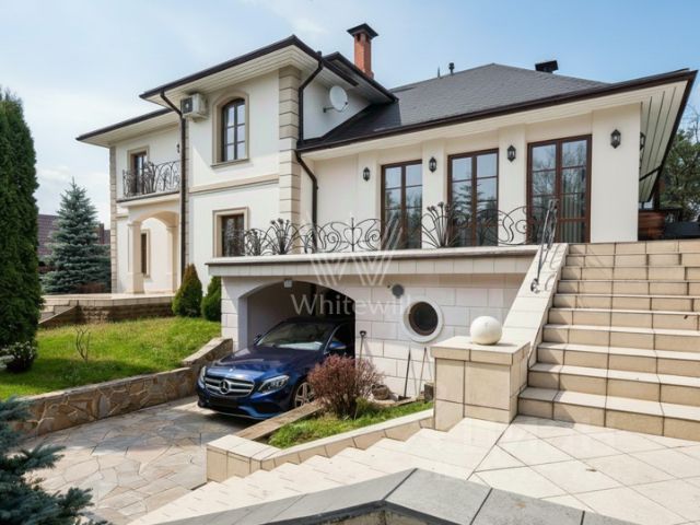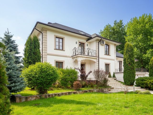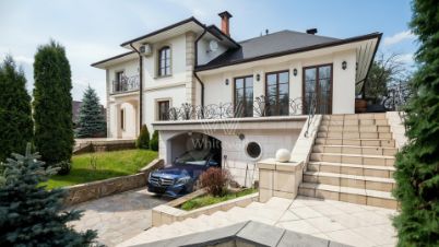 Дом, выполненный в классическом стиле, с балконами, просторной террасой, широкой лестницей ведущей на террасу, расположен на участке среди величественных туй, голубых елей, красивых лиственных деревьев и декоративных кустарников, живописных цветников.