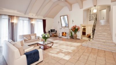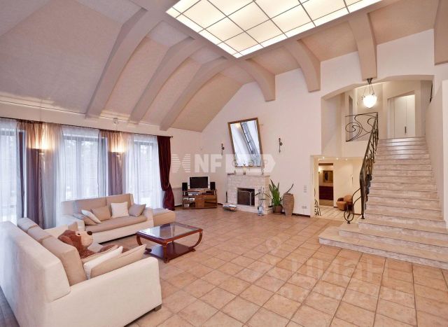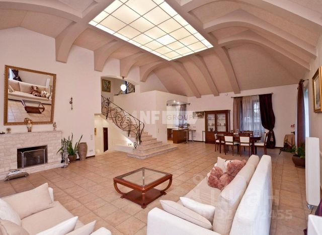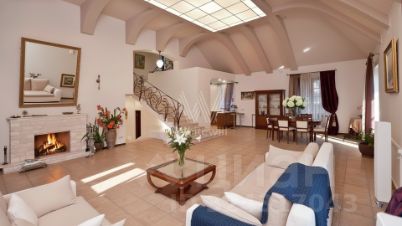 Комфортная внутренняя планировка дома, светлые интерьеры, удобная мебель, гостиная со светлым камином, просторная столовая с овальным столом, выполненным из дерева и интересными стульями с мягкой светлой обивкой, мраморная лестница с красивыми кованными перилами, зеркала в живописных рамах - все гармонично и привлекательно.