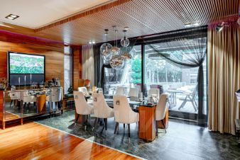 Столовая-гостиная также полностью укомплектована стильной мебелью в натуральном шпоне. Безопасные энергосберегающие просветленные стеклопакеты с теплой дистанционной планкой и заполнением аргоном. Двери Schco (Германия).