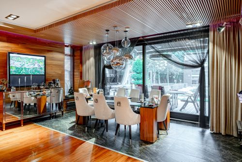 Высококачественная отделка, эксклюзивное цветовое решение стен, установлена современная кухня в натуральном шпоне, полностью укомплектованная шведской техникой Asko, вытяжкой Elica Hidden, встроенной док-станцией с моющим роботом-пылесосом и беспроводной зарядкой для телефона.
