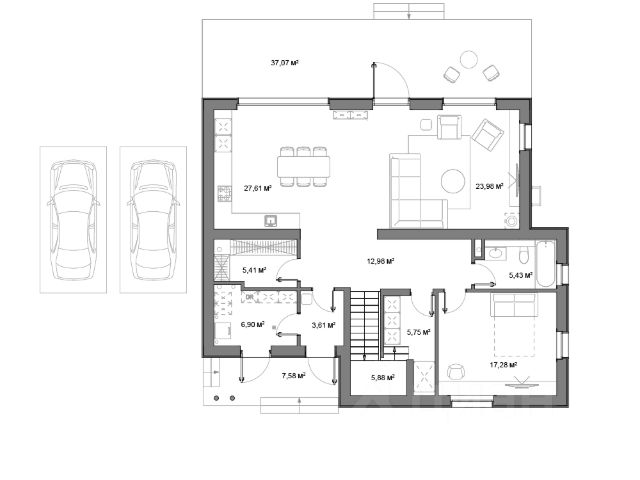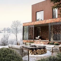 Площадь 2-этажного дома 259,2 кв.м. Стильный коттедж Berry с двумя парковочными местами воплощает эстетичную лаконичность и функциональность. Фасад дома выполнен в кирпиче ручной формовки природного терракотового оттенка и планкене светлого цвета.