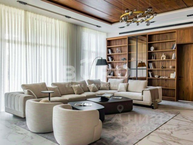 - Первый этаж: прихожая, кладовая, кабинет, санузел, кухня-столовая, гостиная с мраморным камином, терраса с подогреваемым полом, кладовая, котельная, прачечная, бассейн (8х4 м) с противотоком и выходом на участок, сауна, санузел и душевая, гараж на два авто.