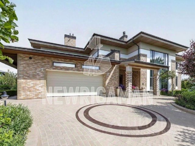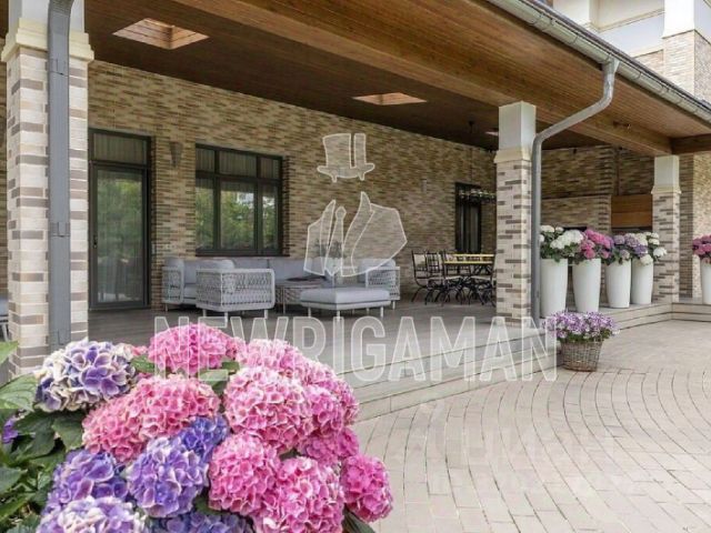 На участке проведены ландшафтные работы, высажены декоративные и лесные деревья, кустарники и цветники, сохранены корабельные сосны, вымощены дорожки, установлено освещение, перед домом установлен фонтан. К дому примыкает гараж на 2 м/м, перед ним парковка на 2 м/м. Отдельно расположены: домик для охраны, дом для персонала (150 кв.м.), гараж на 4 м/м, фонтаны и беседки.