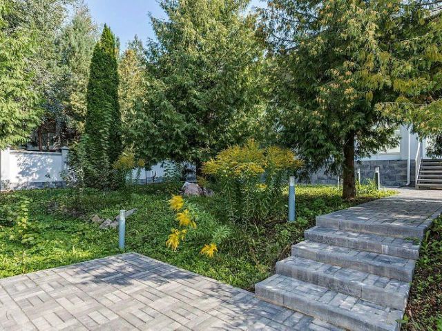 Ухоженный участок 30 соток одной стороной граничит с лесом. На нем: ели, по всему периметру посажены красные клены, японские лиственницы, вишни. Красивый газон, многолетние цветы, выложены дорожки из тротуарной плитки, у выезда обустроена площадка для парковки автомобилей.