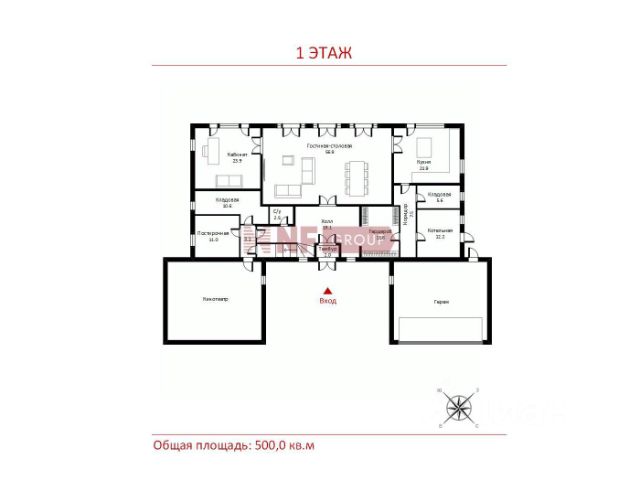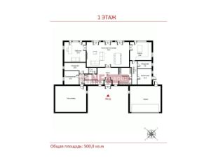 1 этаж: кухня-столовая-гостиная (74,8), кабинет (13,2), комната отдыха (18,2), лестничный холл и лифт (20,5), котельная (8), кладовая (6,7), с/у (2,6), гараж (42,9).