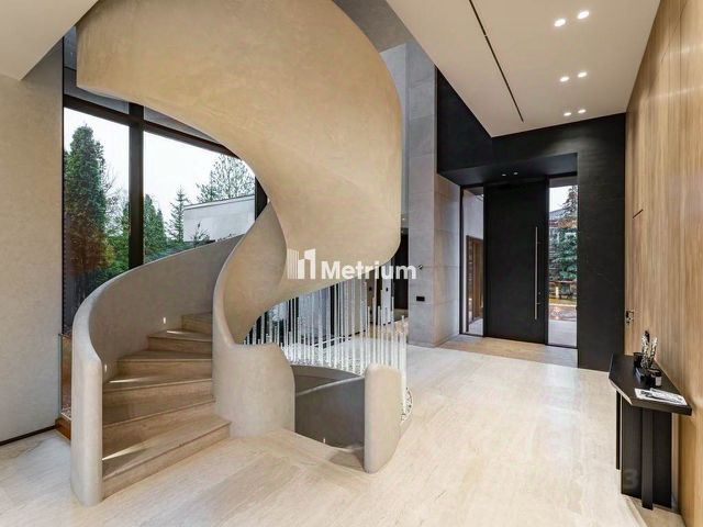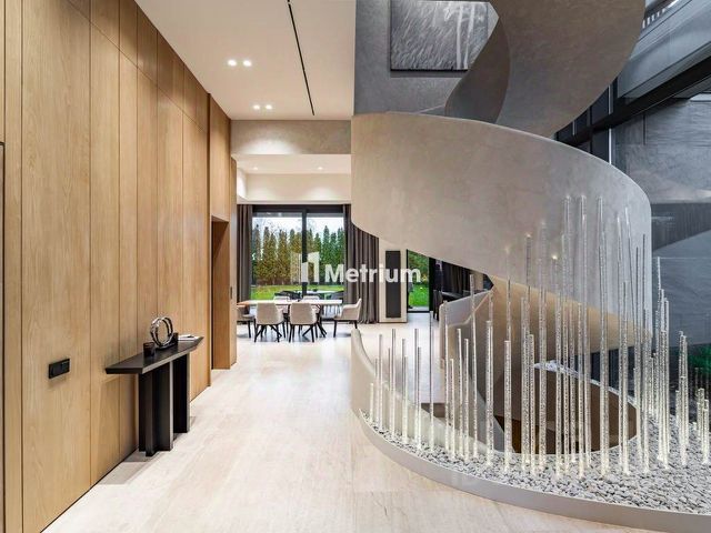 В доме: 4 спальни с ванными и гардеробными, гостиная-столовая, кухня, хобби-комната 50 кв.м, двухуровневая спа-зона с хаммамом, сауной и джакузи, гараж на 2 м/м с зарядкой для электроавтомобиля и помещением для водителя, котельная, отдельный блок персонала с профессиональной кухней в цоколе.